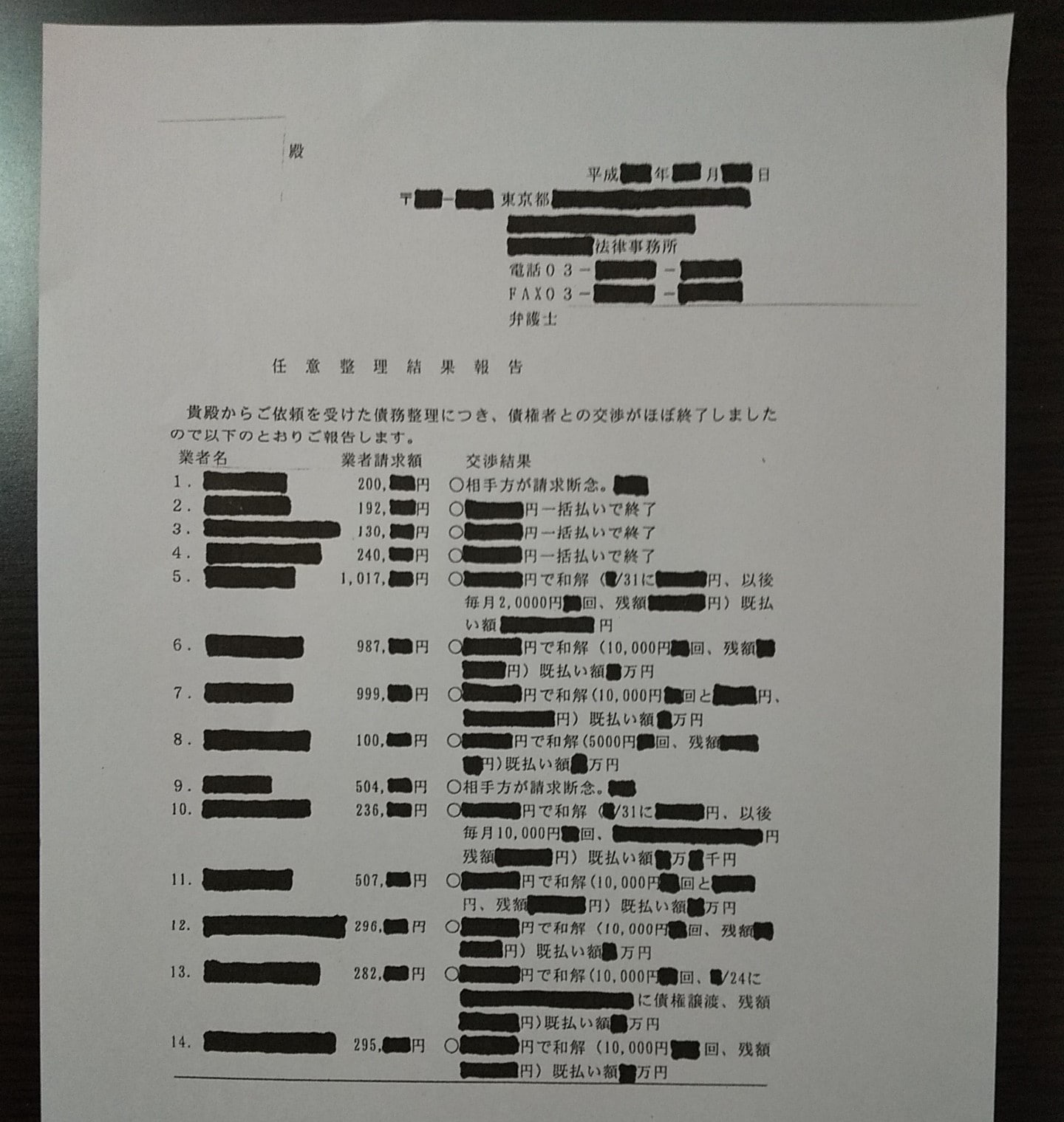 最初の債務整理の任意整理結果報告書。14社の債務を整理し、完済した