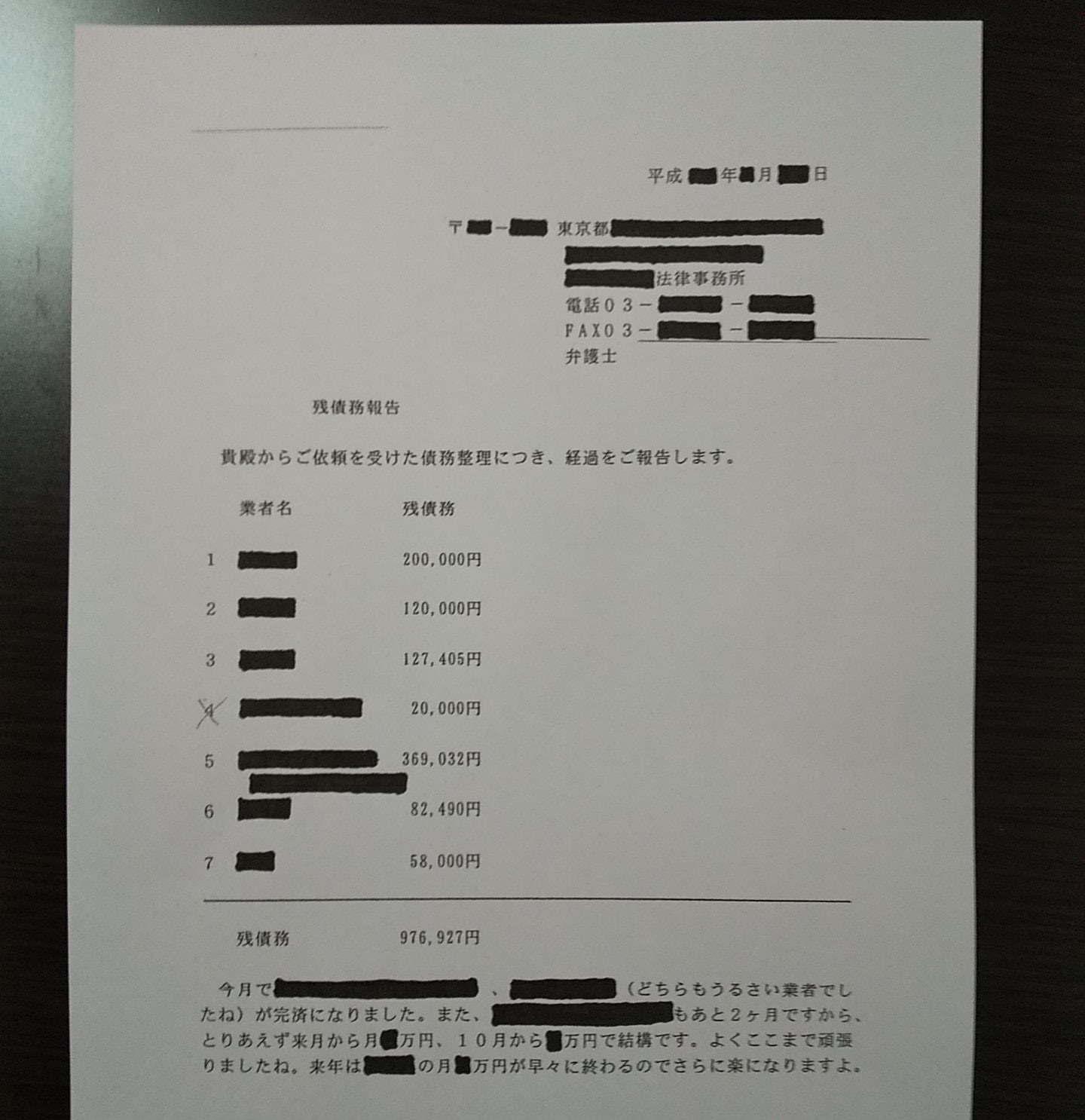 最初の債務整理の残債務報告書。末尾には「よくここまで頑張りましたね」という弁護士コメントも